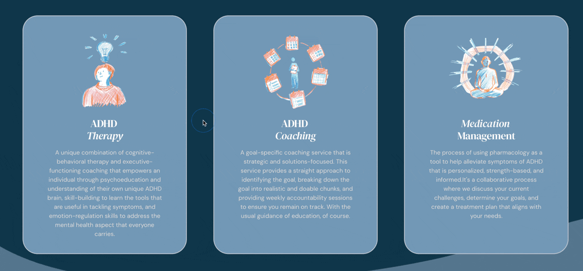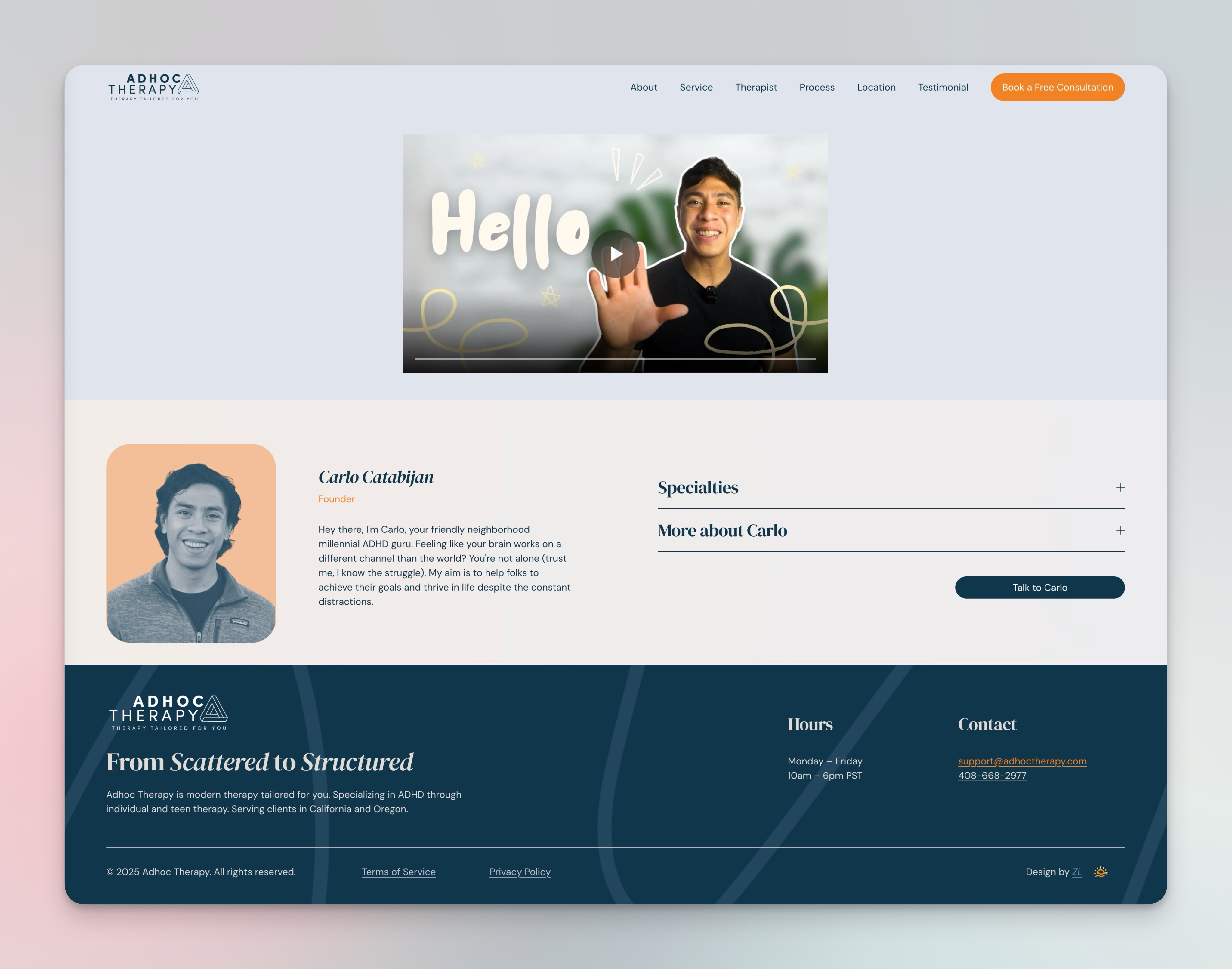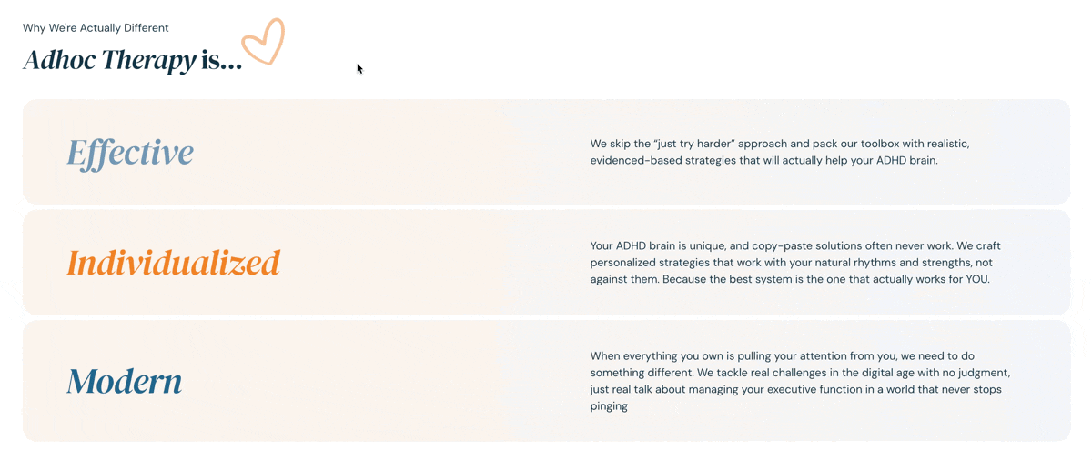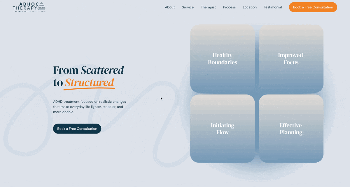 I redesigned Adhoc Therapy, an ADHD-focused mental health practice, into a minimal one-page Squarespace website. The goal was to simplify their message and guide visitors toward a single, clear call-to-action: Book a Session. The project aimed to balance a professional and trustworthy tone with a warm, creative energy that reflects the supportive nature of therapy.