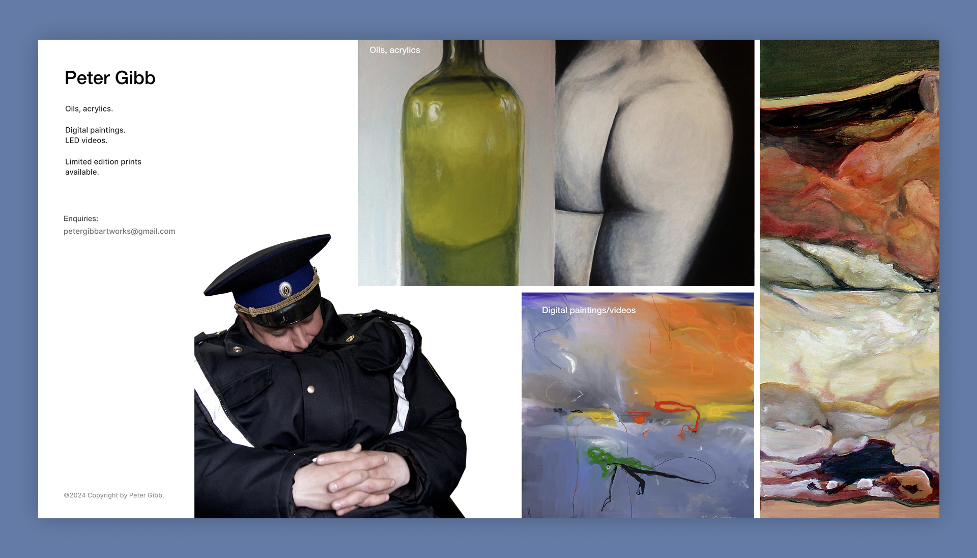 I designed and developed a portfolio website for Peter Gibb, bringing his “Doorkeeper” creative concept to life through a minimalist image slider. The website provides an immersive yet simple browsing experience, allowing visitors to engage with his artwork in a clean, distraction-free environment.