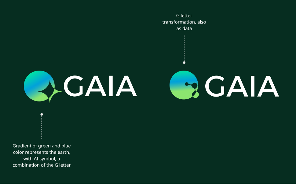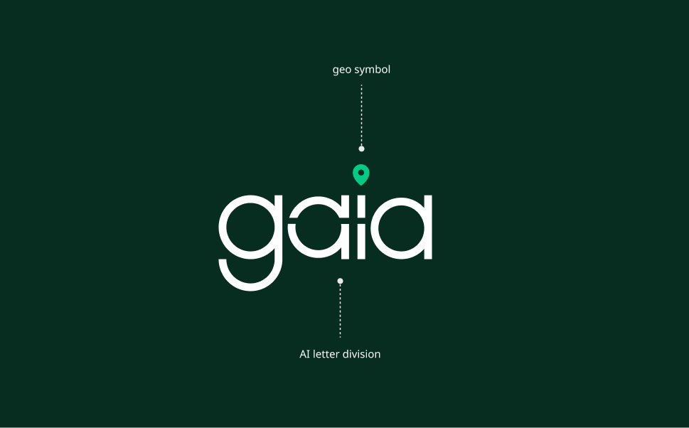 Gaia is a brand centered on geospatial data, machine learning, and artificial intelligence. The logo concept blends digital aesthetics with an environmental theme, representing the fusion of modern technology and earth conservation. The design incorporates earthy shades of green and blue to reflect this balance.