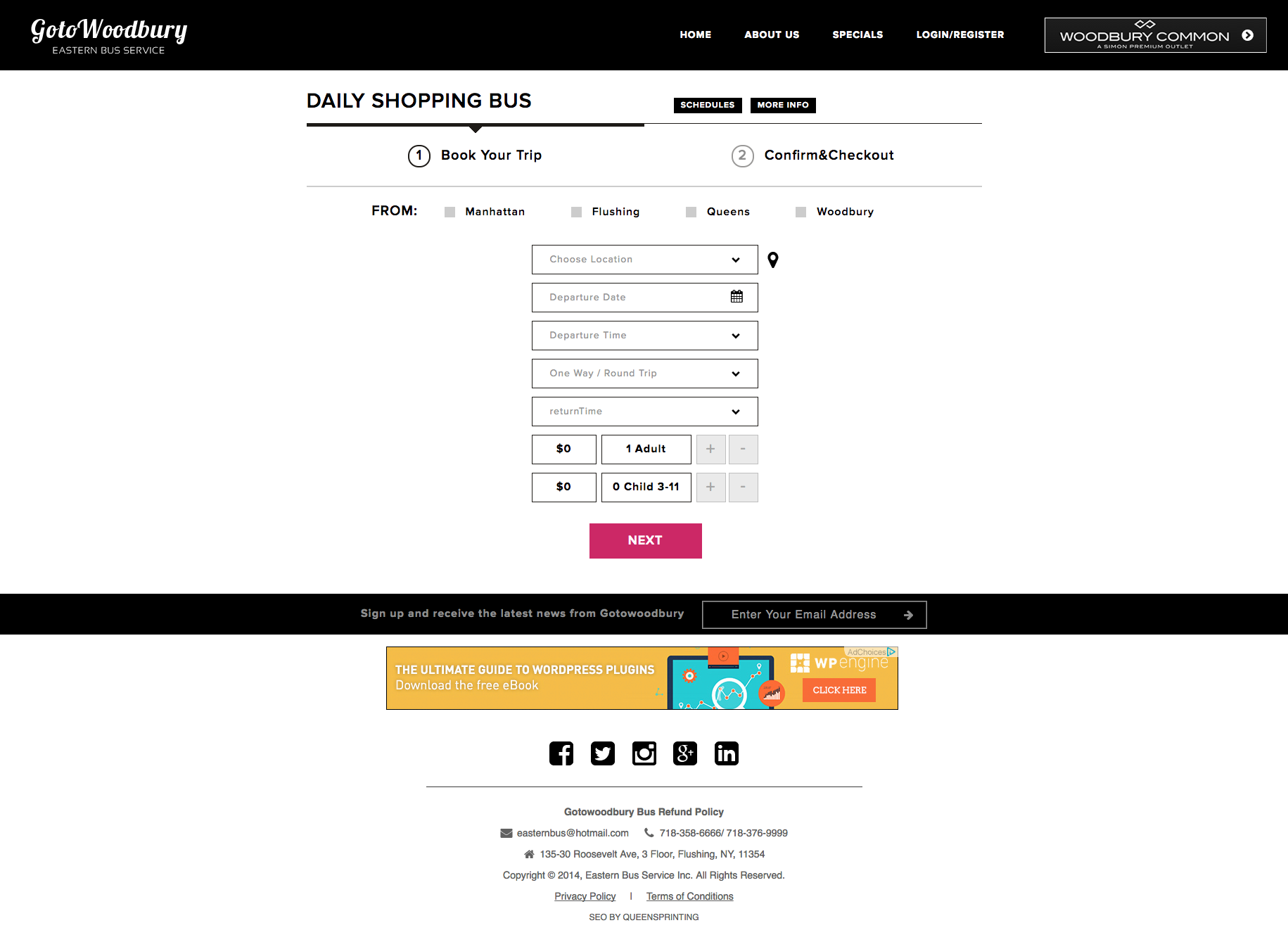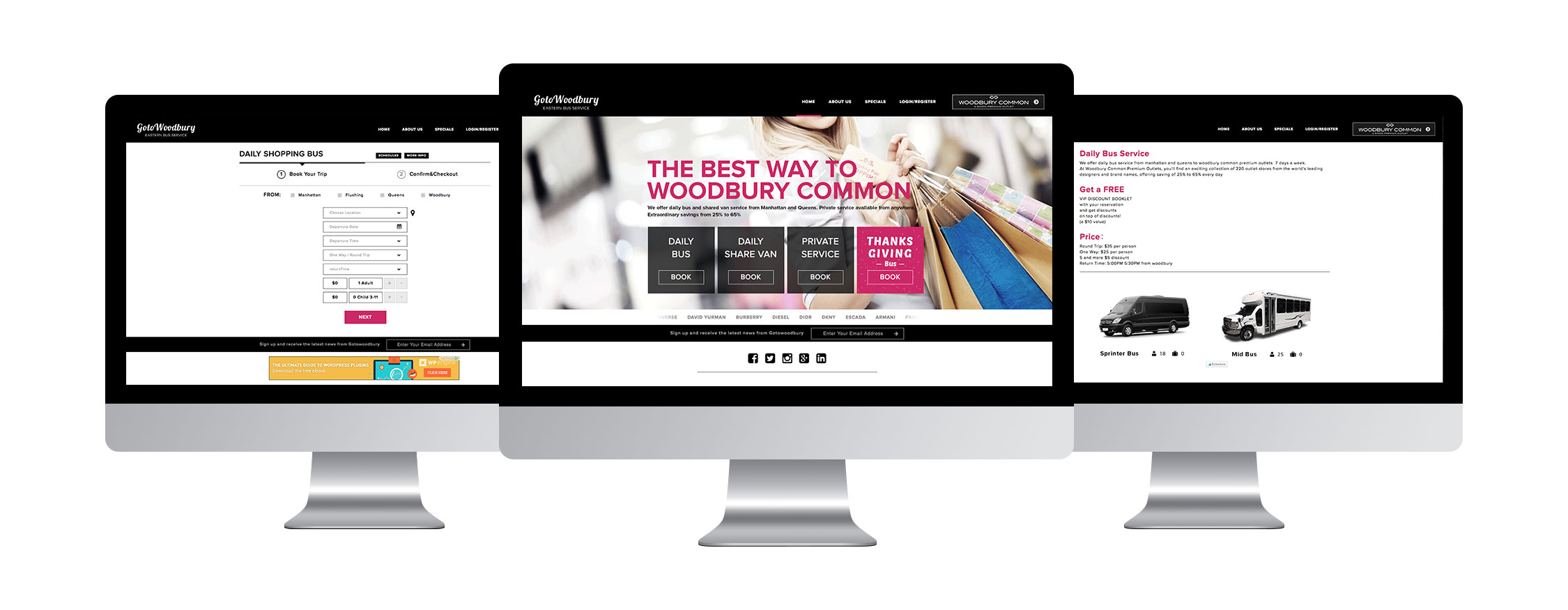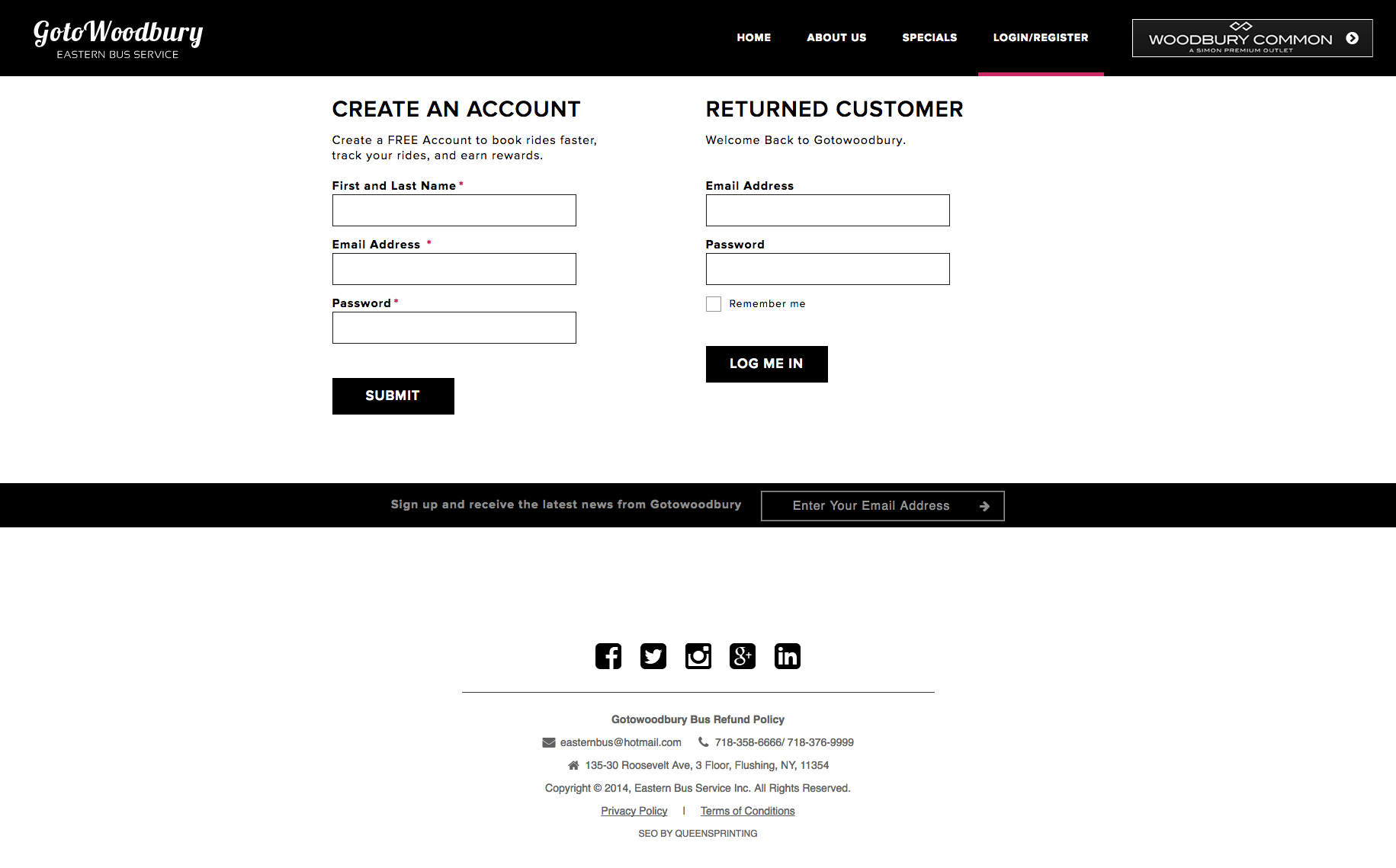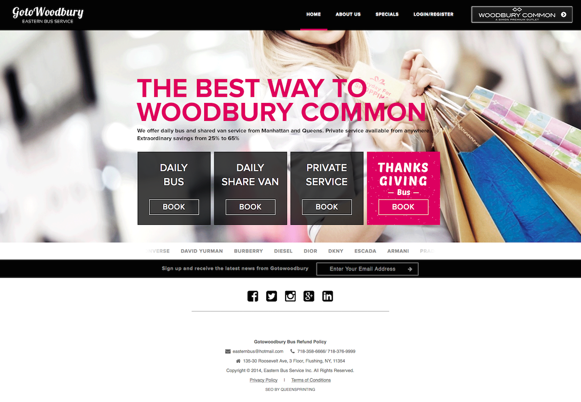 Gotowoodbury.com is an e-commerce web system, designed for Eastern Bus Service, Inc. This website provides users to book buses specifically for Woodbury shopping. Users will also be able to buy tickets online.