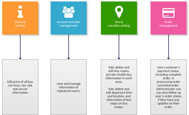 Administrators can easily manage and edit bus departure place and time, view customers’ personal information, numbers of tickets, pickup location, pickup time, etc.