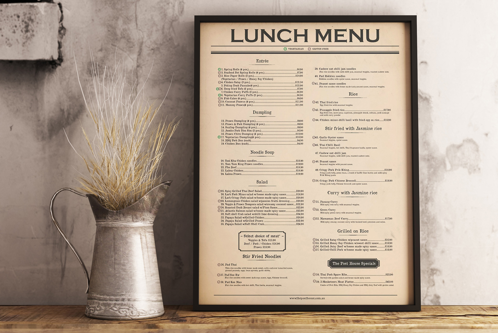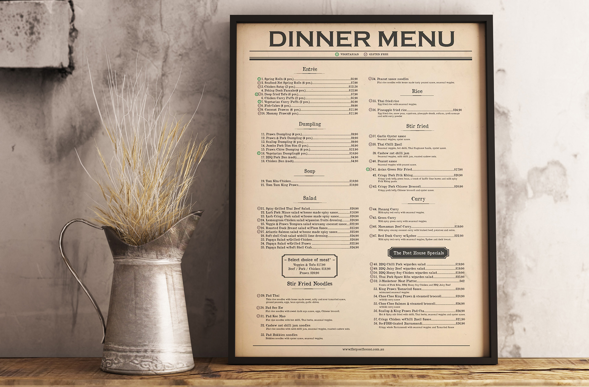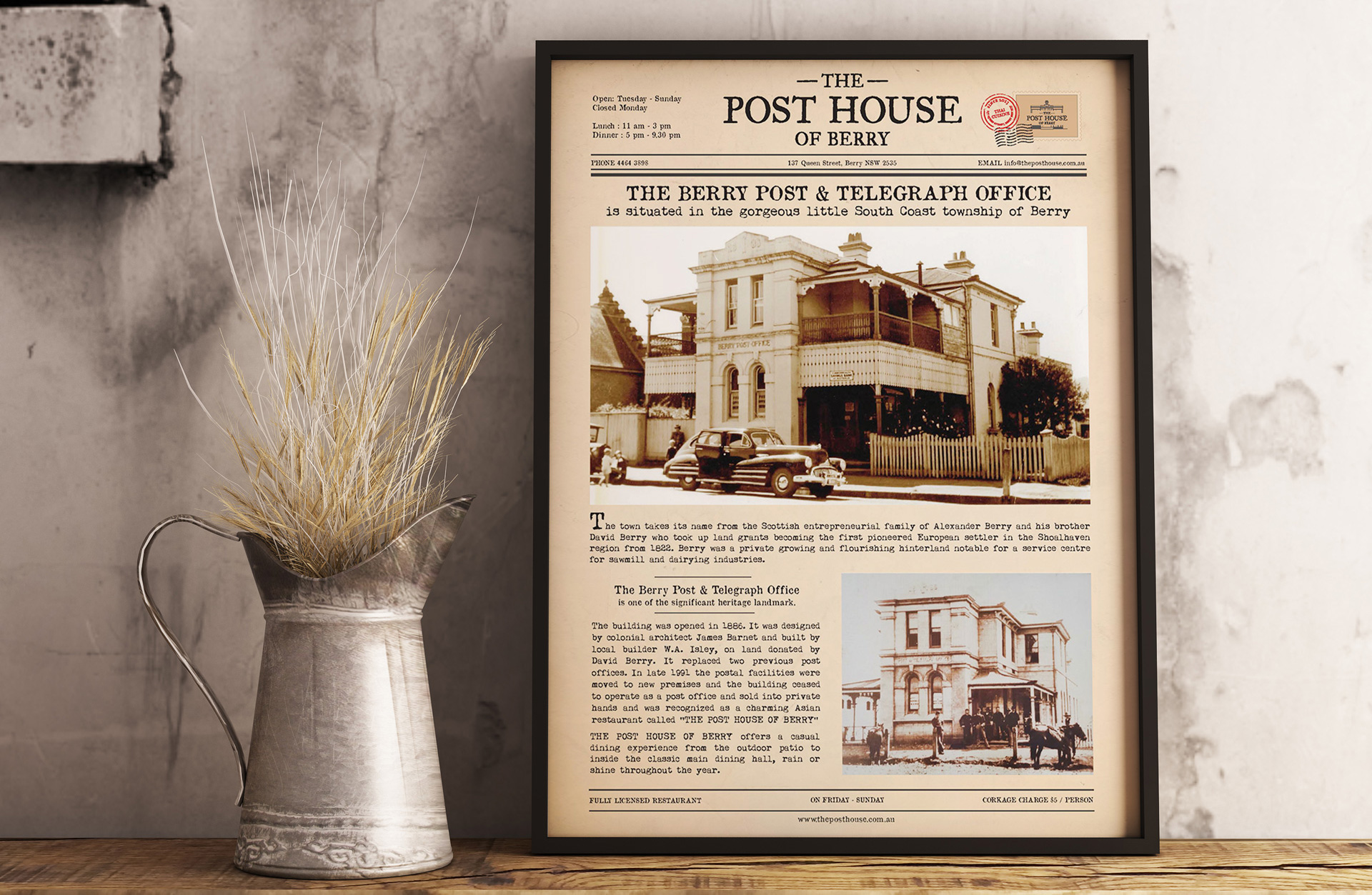 The Post House of Berry is seeking a redesign of its menu to reflect its diverse culinary offerings and the unique ambiance of its location in Berry’s old post office building. The concept is to utilize elements reminiscent of old newspapers and postage stamps to create a menu that evokes a sense of heritage and authenticity while showcasing the diverse culinary offerings of the restaurant.