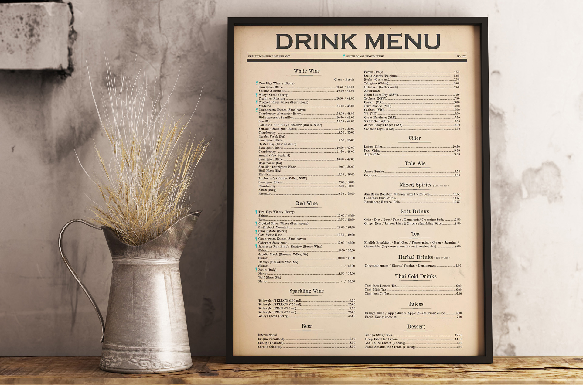 Tasked with infusing the menu design with a nostalgic charm that pays homage to the building’s history as Berry’s old post office, I drew inspiration from vintage newspapers and postage stamps. The layout resembles the format of a vintage newspaper, incorporating columns, headlines, and text boxes for menu items and descriptions.